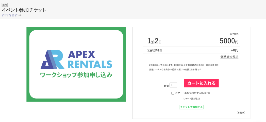 下記ボタンよりお申込みページへ進み、イベント参加チケットをカートに入れてレンタルをお申し込み頂く時と同じようにお申込みください。