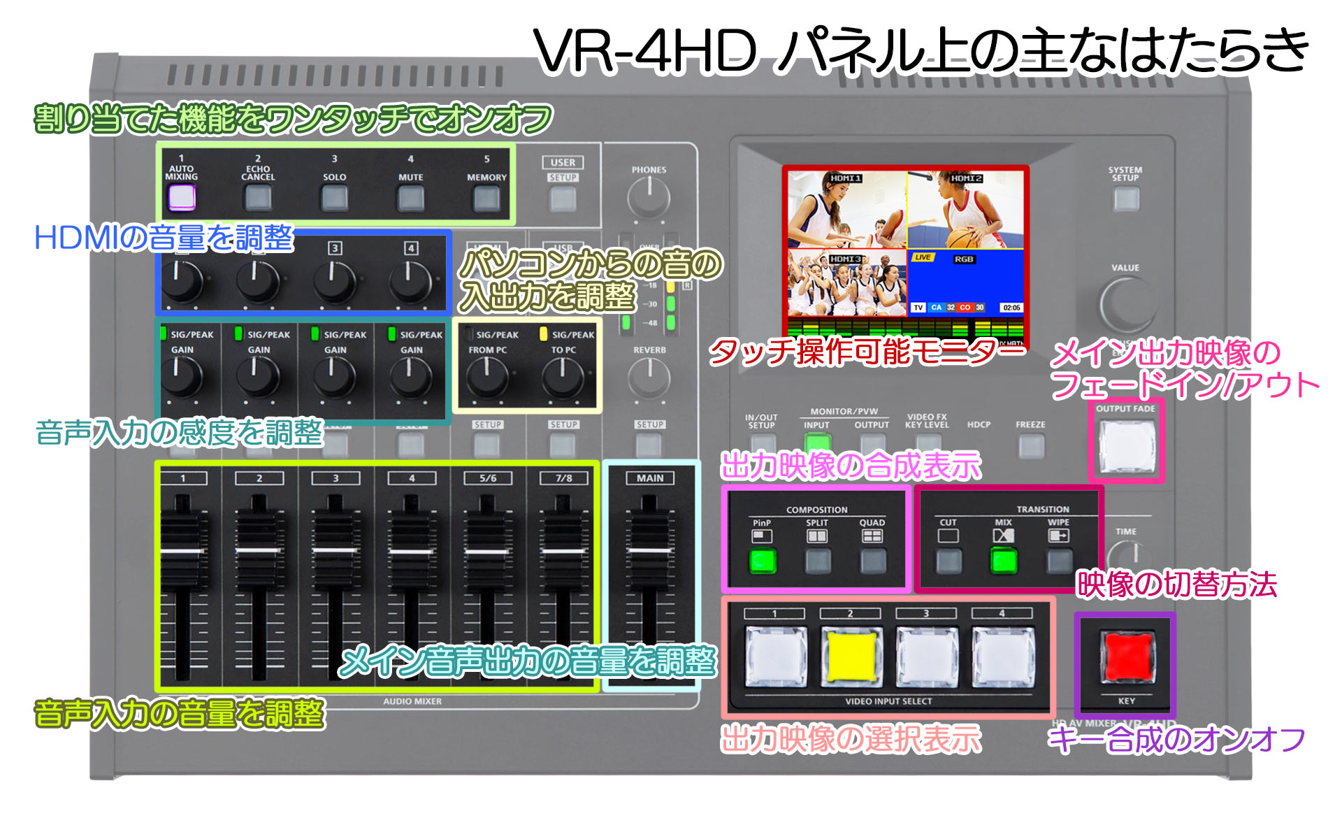 VR-4HDは、映像のスイッチング、定番のPinPや様々なトランジション(映像切り替え)はもちろんのこと、音のミキシングも可能で、オーディオにエフェクトかけられて、さらにUSBループバック機能(※)も備わっている、様々なことを高い次元で実現できるAVミキサーです。