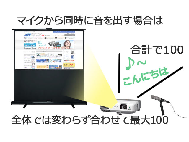 マイクを繋いでも繋がなくても、プロジェクターから出せる音の合計は最大100%で、片方を大きくするともう片方は小さくなって出力されます。